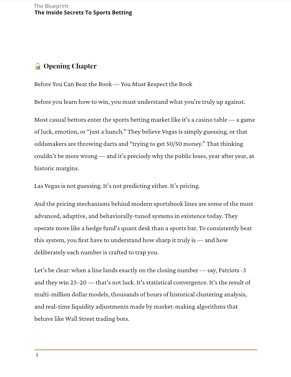 The Blueprint is not a casual sports betting course. It is the culmination of years of real-world sharp betting, market modeling, and documented profitable case studies that are normally reserved for private syndicates and elite bettors.